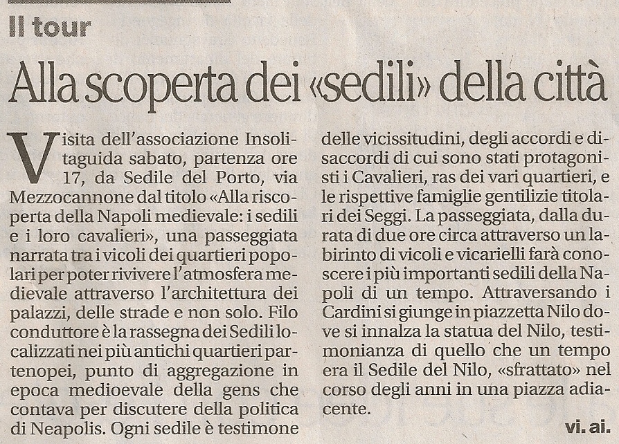 Visita dell' associazione Insolitaguida sabato, partenza ore 17, da Sedile del Porto, via Mezzocannone dal titolo «Alla riscoperta dilla Napoli medievale: i sedili e i loro cavalieri», una passeggiata narrate tra i vicoli dei quartieri popolari per poter rivivere l'atmosfera medievale attraverso l'architettura dei palazzi, delle strade e non solo. Filo conduttore è la rassegna dei Sedili localizzati nei più antichi quartieri partenopei, punto di aggregazione in epoca medioevale della gens che contava per discutere della politica di Neapolis. Ogni sedile è testimone delle vicissitudini, degli accordi e disaccordi di cui sono stati protagonisti i Cavalieri, ras dei vari quartieri, e le rispettive famiglie gentilizie titolari dei Seggi. La passeggiata, dalla durata di due ore circa attraverso un labirinto di vicoli e vicarielli farà conoscere i più importanti sedili della Napoli di un tempo. Attraversando i Cardini si giunge in piazzetta Nilo dove si innalza la statua del Nilo, testimonianza di quello che un tempo era il Sedile del Nilo, «sfrattato» nel corso degli anni in una piazza adiacente.