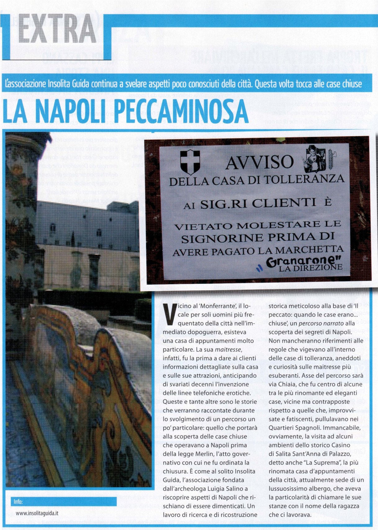 Vicino al Monferrante, il locale per soli uomini più frequentato della città nell'immediato dopoguerrra, esisteva una casa di appuntamenti molto particolare. La sua maitresse, infatti, fu la prima a dare ai clienti informazioni dettagliate sulla casa e sulle sue attrazioni, anticipando di svariati decenni l'invenzione delle linee telefoniche erotiche. Queste e tante altre sono le storie che verranno raccontate durante lo svolgimento di un percorso un pò particolare: quello che porterà alla scoperta delle case chiuse che operavano a Napoli prima delle legge Merlin, l'atto governativo con cui ne fu ordinata la chiusura. E' come al solito Insolitaguida, l'associazione fondata dall'archeologa Luigia Salino a riscoprire aspetti di Napoli che rischiano di essere dimenticati. Un lavoro di ricerca e ricostruzione storica meticoloso alla base de "Il Peccato: quando le case erano ... chiuse, una passeggiata narrata alla scoperta dei segreti di Napoli. Non mancheranno riferimenti alle regole che vigevano all'interno delle case di tolleranza, aneddoti e curiosità sulle maitresse più esuberanti. Asse del percorso sarà via Chiaia, che fu centro di alcune tra le più rinomate ed eleganti case, vicine ma contrapposte rispetto a quelle che, improvvisate e fatiscenti, pullulavano nei Quartieri Spagnoli. Immancabile, ovviamente, la visita ad alcuni ambienti dello storico Casino di Sant'Anna di Palazzo, detto anche "La Suprema", la più rinomata casa d'appuntamenti della città, attualmente sede di un lussuosissimo albergo, che aveva la particolarità di chiamare le sue stanze con il nome delle ragazza che ci lavorava.