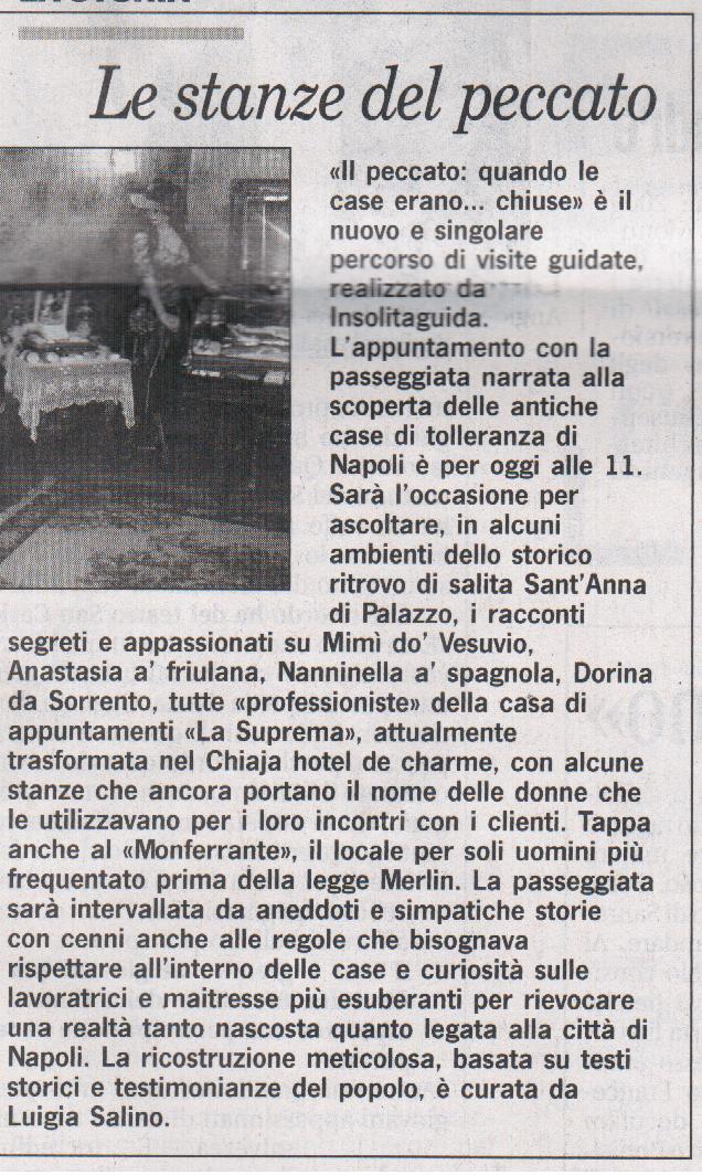 Anastasia a’ friulana, Nanninella a' spagnola, Dorina da Sorrento, tutte «professioniste» della casa di appuntamenti «La Suprema», attualmente trasformata nel Chiaja hotel de charme, con alcune stanze che ancora portano il nome delle donne che le utilizzavano per i loro incontri con i clienti. Tappa anche al «Monferrante», il locale per soli uomini più frequentato prima della legge Merlin. La passeggiata sarà intervallata da aneddoti e simpatiche storie con cenni anche alle regole che bisognava rispettare all’interno delle case e curiosità sulle lavoratrici e maitresse più esuberanti per rievocare una realtà tanto nascosta quanto legata alla città di Napoli. La ricostruzione meticolosa, basata su testi storici e testimonianze del popolo, è curata da Luigia Salino.