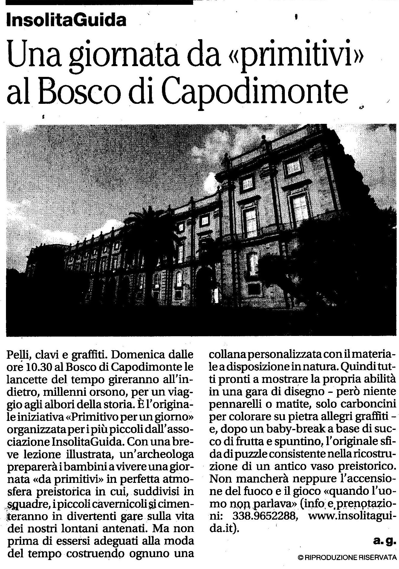 Pelli, clavi e graffiti. Domenica dalle ore 10.30 al Bosco di Capodimonte le lancette del tempo giteranno all'indietro, millenni orsono, per un viaggio agli albori della storia. È l'originale iniziativa «Primitivo per un giorno» organizzata per i più piccoli dall' associazione InsolitaGuida.
